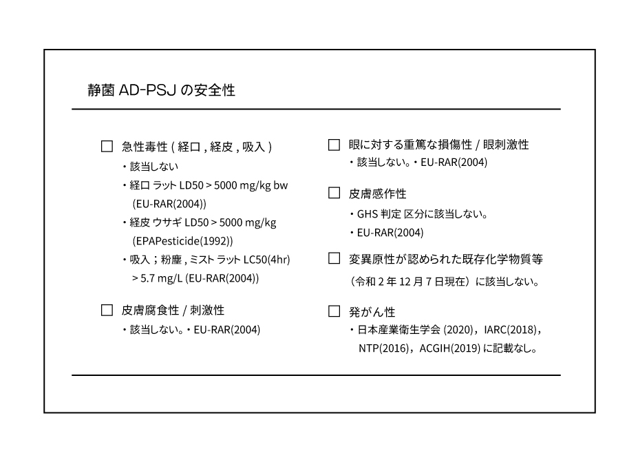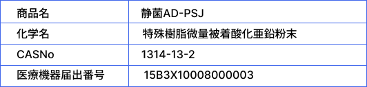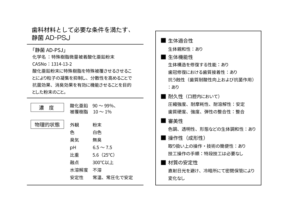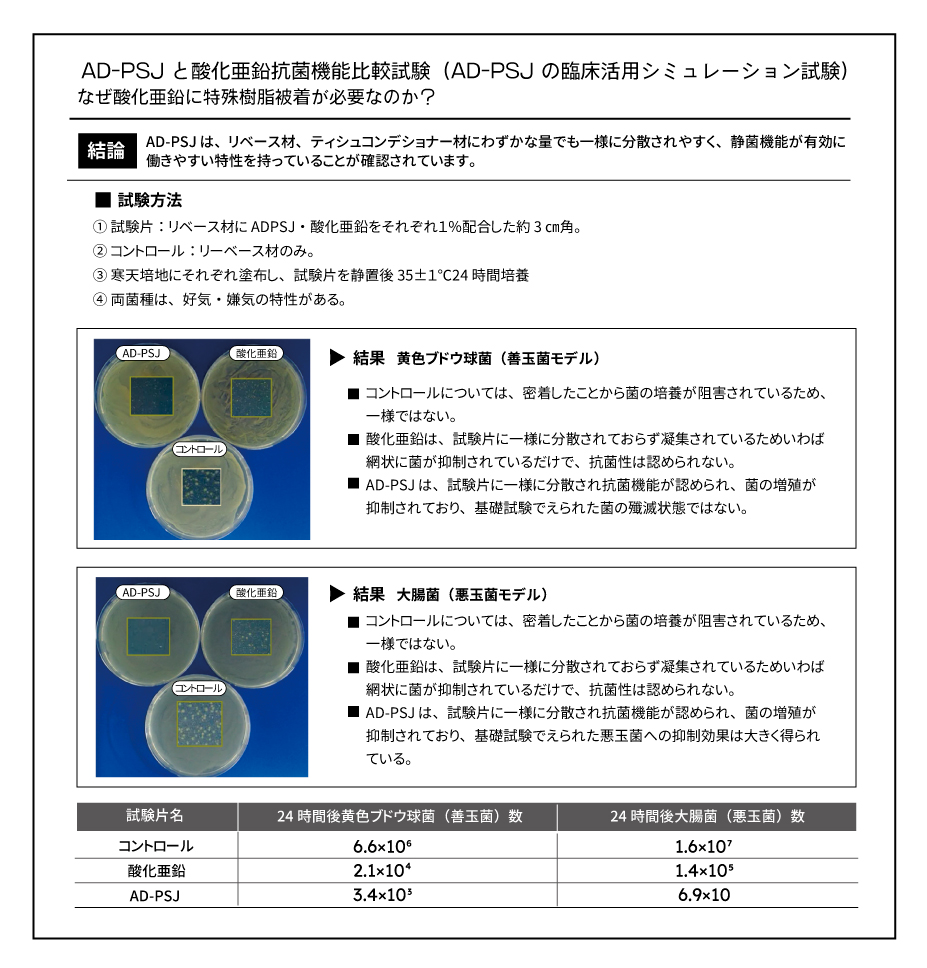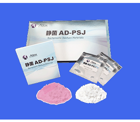 「静菌AD-PSJ」は酸化亜鉛を表面改質(特殊樹脂を特殊付着)した粉末であり、例えば義歯リベース材、テイッシュコンディショナーに重量比1%程度配合することで、歯周病原因菌、齲蝕原因菌、真菌の増殖やデンチャープラークの付着抑制が期待できます。高齢の患者様にとっては、お口に優しく、口腔内環境の改善に寄与する材料としてお役に立てることが期待できます。